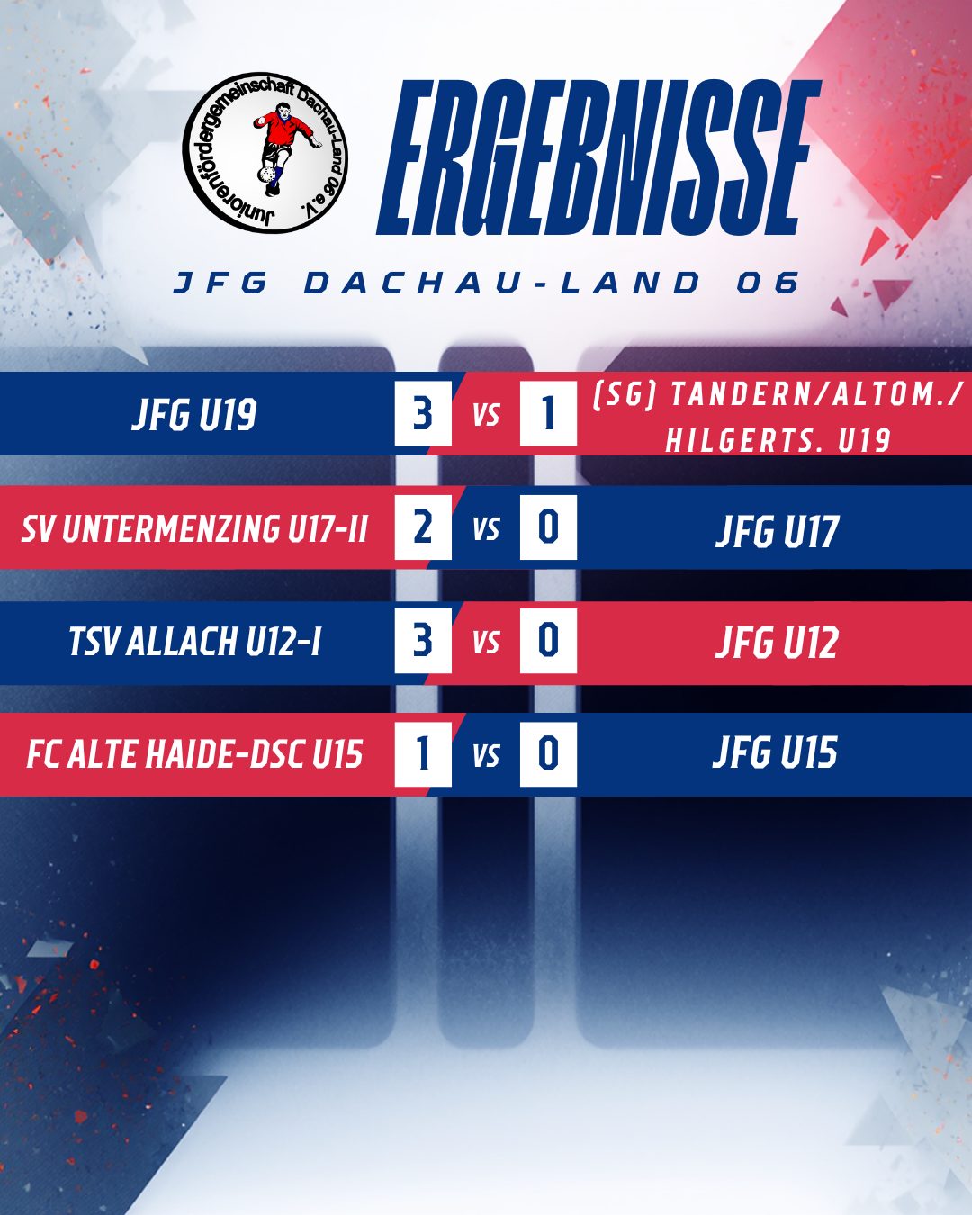 Ein Wochenende voller Leidenschaft und Dominanz: Unsere JFG-Teams glänzen mit Teamgeist und einem wahren Torfestival auf den heimischen Plätzen! So kann es weitergehen! U19: Souveräner Kantersieg zum Wochenstart Was für eine Demonstration unserer U19! Am Montagabend ließen unsere Jungs gegen die (SG) Hebertshausen/Röhrmoos/Ampermoching U19-II rein gar nichts anbrennen. Von der ersten Minute an kontrollierte die JFG das Geschehen im Sportzentrum Petershausen. Andreas Kiefl eröffnete den […]